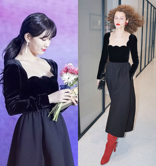 Suzy trở thành tâm điểm của sự chú ý trong thiết kế Váy mùa thu của Valentino. Phần cổ áo viền vỏ sò cách tân thu hút mọi ánh nhìn. Chất liệu vải nhung màu đen tương phản một cách hoàn hảo với làn da trắng hồng của người đẹp.