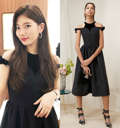 Xuất hiện tại Triển lãm BST Ria tại Chaumet Boutique (một thương hiệu trang sức của Pháp) ở Hong Kong, nàng thơ khoác lên người chiếc váy suông đen tuyền của Fendi. Sự kết hợp giữa phần cổ áo và thiết kế hở vai khiến “cô Bae” trông thật sang trọng nhưng vẫn toát lên vẻ nữ tính, đáng yêu. Việc nhấn mạnh sự nổi bật của bộ váy bằng các chi tiết phụ kiện cũng là một lựa chọn tuyệt vời.