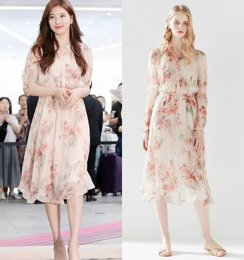 Đằng sau nụ cười bừng sáng của Suzy là thiết kế váy hoa đến từ thương hiệu VANESSA BRUNO AHTE. Sự kết hợp với khuyên tai hạt dài và giày cao gót có quai màu nude khiến chiếc váy càng trở nên hoàn hảo hơn, cũng như bộc lộ rõ nét nữ tính của cô nàng.