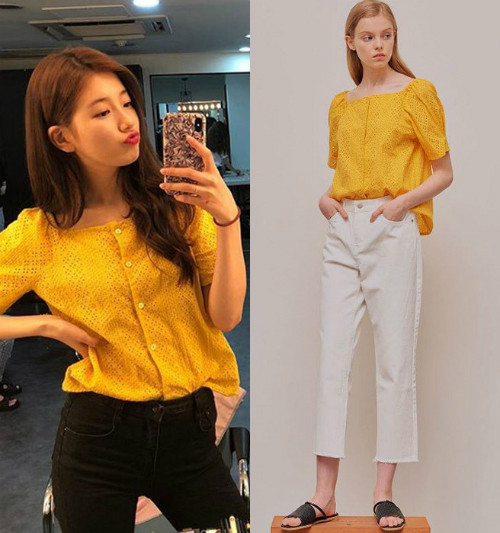 Chiếc áo màu vàng mustard của Adsense được Suzy diện trong fan meeting mới đây phù hợp hoàn hảo với nữ idol, đen đến cảm giác tươi mới như thổi bay cái nóng Hè.