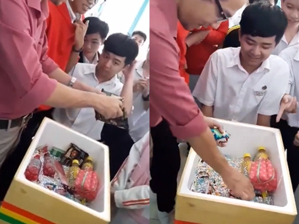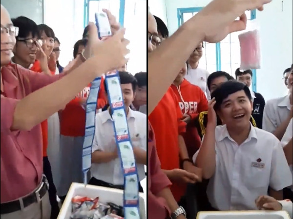 Mới đây, một đoạn clip ghi lại hình ảnh thầy giáo đang mở quà sinh nhật khiến cộng đồng mạng thích thú truyền tay nhau. Những món quà mà thầy giáo nhận được từ học trò là siêu "lầy" và độc đáo! Người được nhận món quà là thầy Lê Minh, thầy giáo Ngữ văn của lớp 11A2. Đây là sinh nhật lần thứ 24 của thầy nên lớp chia sẻ rằng các bạn ấy rất muốn gửi tặng một món quà có ý nghĩa và tình cảm.