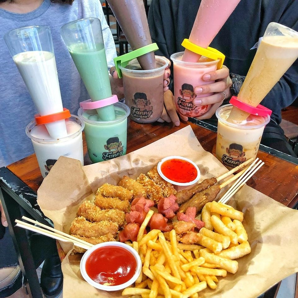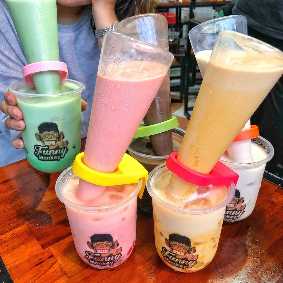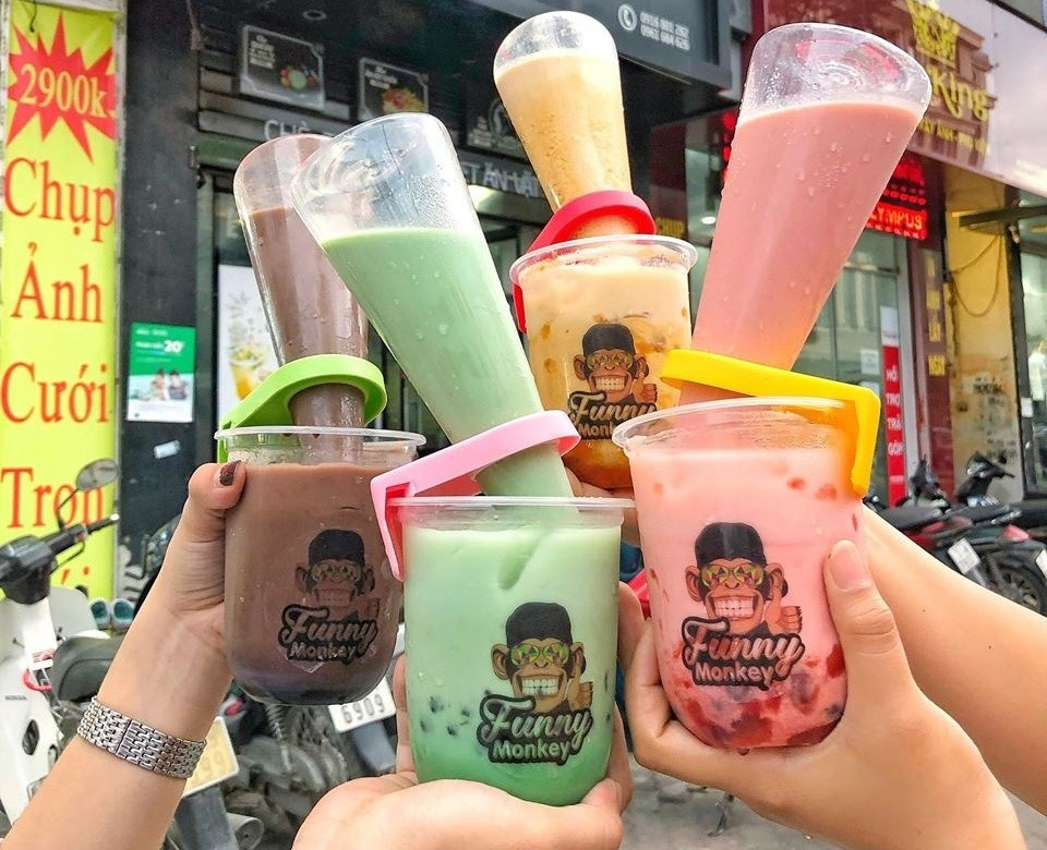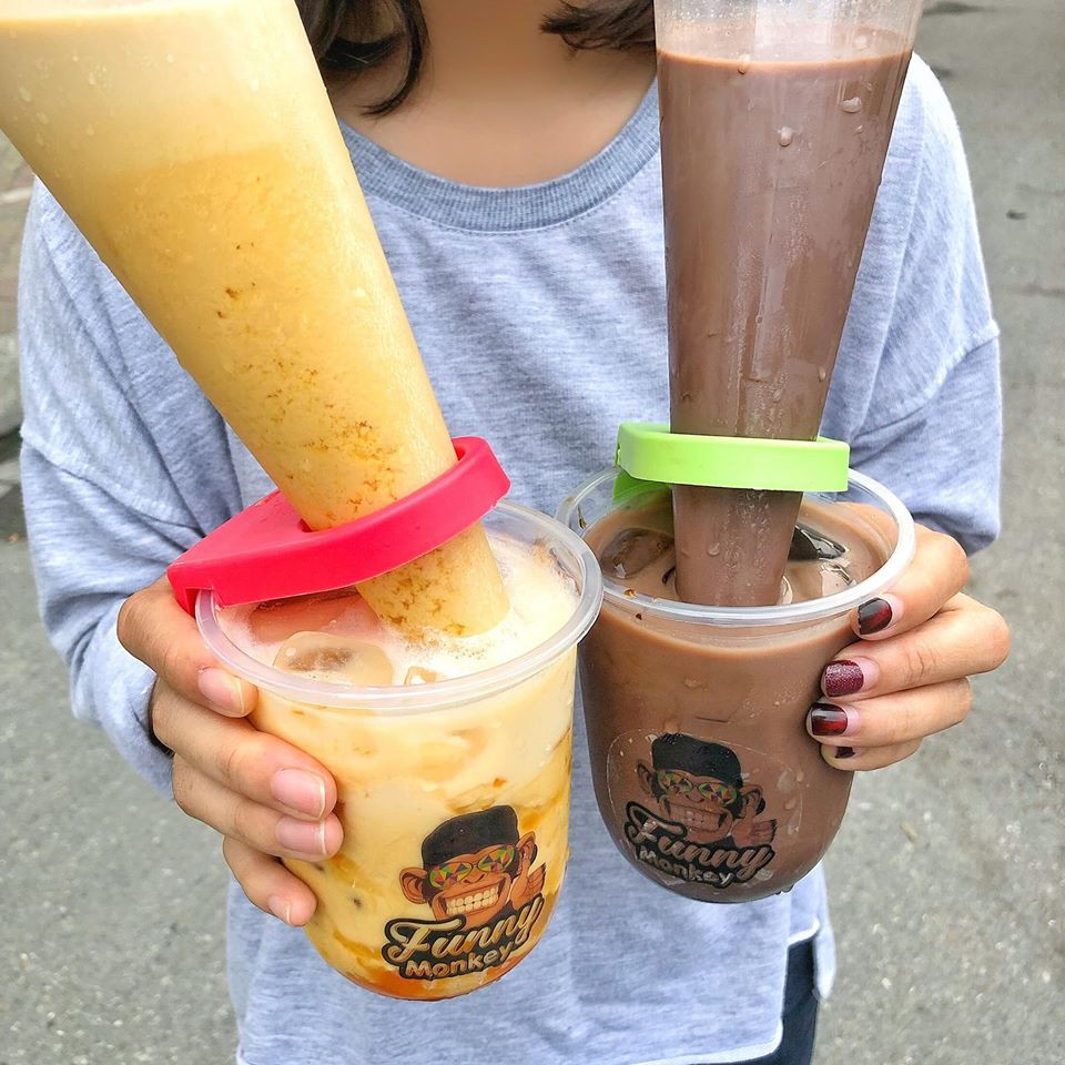 Hương vị trà sữa thì gồm có trà sữa đào, trà sữa dâu tây, sữa tươi...topping thì có trân châu, trân châu đường đen, thạch...Dù không quá phong phú như nhiều quán trà sữa thông thường khác, nhưng cách uống thú vị này cũng vẫn đủ sức làm điên đảo trong cộng đồng ẩm thực.