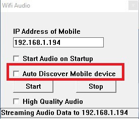 Bây giờ, kích vào biểu tượng của phần mềm WifiAudio Server trên máy tính. Tại hộp thoại hiện ra, bạn điền dãy số IP có trên giao diện của ứng dụng vào khung “IP Address of Mobile”, đánh dấu vào tùy chọn “High Quality Audio” để phát âm thanh chất lượng cao từ máy tính lên smartphone, sau đó nhấn nút “Start”