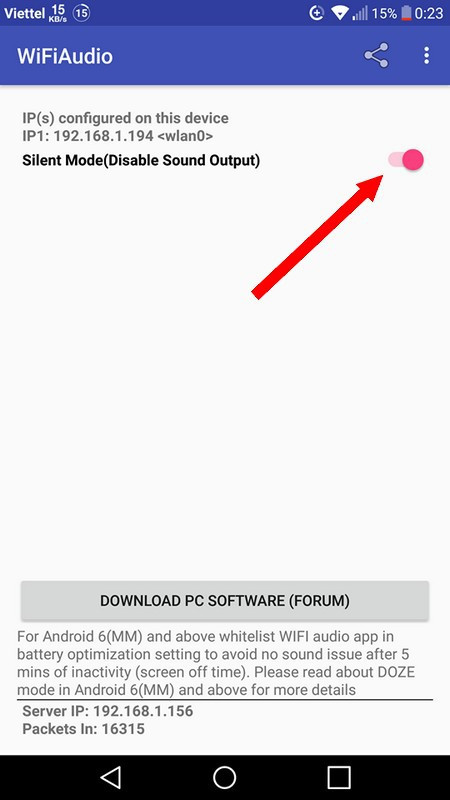Tiếp theo tiến hành cài đặt ứng dụng WifiAudio trên smartphone của bạn. Giao diện chính của ứng dụng khá đơn giản và hiển thị một dãy số IP, đây là dãy số IP dùng để kết nối giữa smartphone và máy tính của bạn.