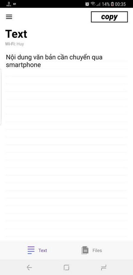Tiếp theo bạn truy cập vào ứng dụng AirForShare trên smartphone tại mục “Text” sẽ hiển thị nội dung văn bản đã soạn trên máy tính. Bạn có thể nhấn nút “Copy” để sao chép nội dung văn bản này và sử dụng trên smartphone. Ngoài ra bạn cũng có thể sử dụng cách thức này để gửi một đường link trang web từ máy tính lên smartphone để truy cập trên thiết bị di động.