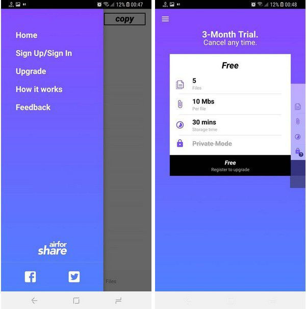 Để thực hiện điều này, từ giao diện chính của AirForShare trên smartphone, bạn nhấn vào nút menu ở góc trên bên trái, sau đó chọn “Upgrade” từ menu hiện ra. Tại giao diện tiếp theo, bạn nhấn chọn “Free”.