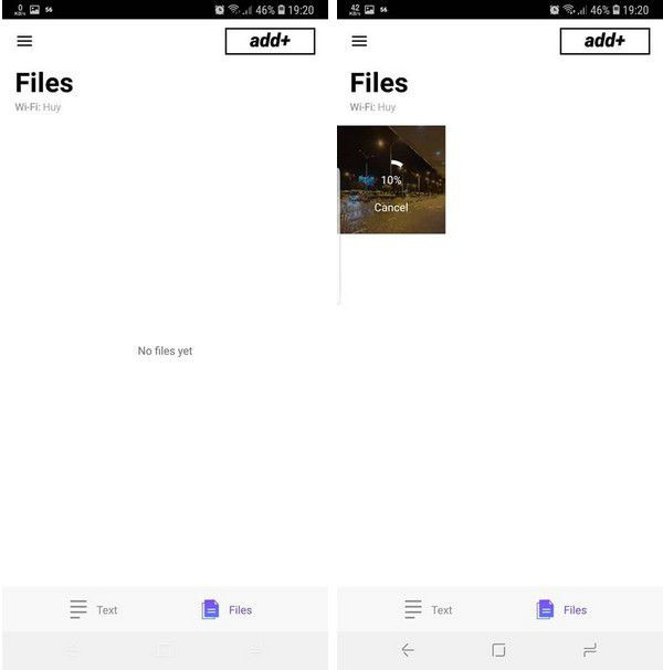 Còn trong trường hợp muốn gửi file bất kỳ từ smartphone sang máy tính, bạn chọn tab “Files” trên giao diện ứng dụng, sau đó nhấn nút “add+” ở góc trên bên phải rồi chọn file cần gửi. Chờ trong giây lát để quá trình upload file được diễn ra.
