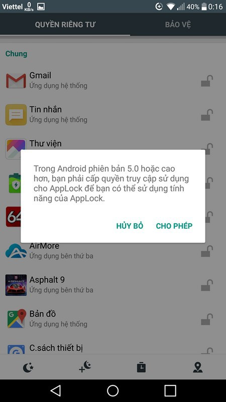 Để có thể khóa lại các ứng dụng, đầu tiên người dùng cần phải cấp quyền cho AppLock. Nhấn vào “Cho phép” từ hộp thoại hiện ra.