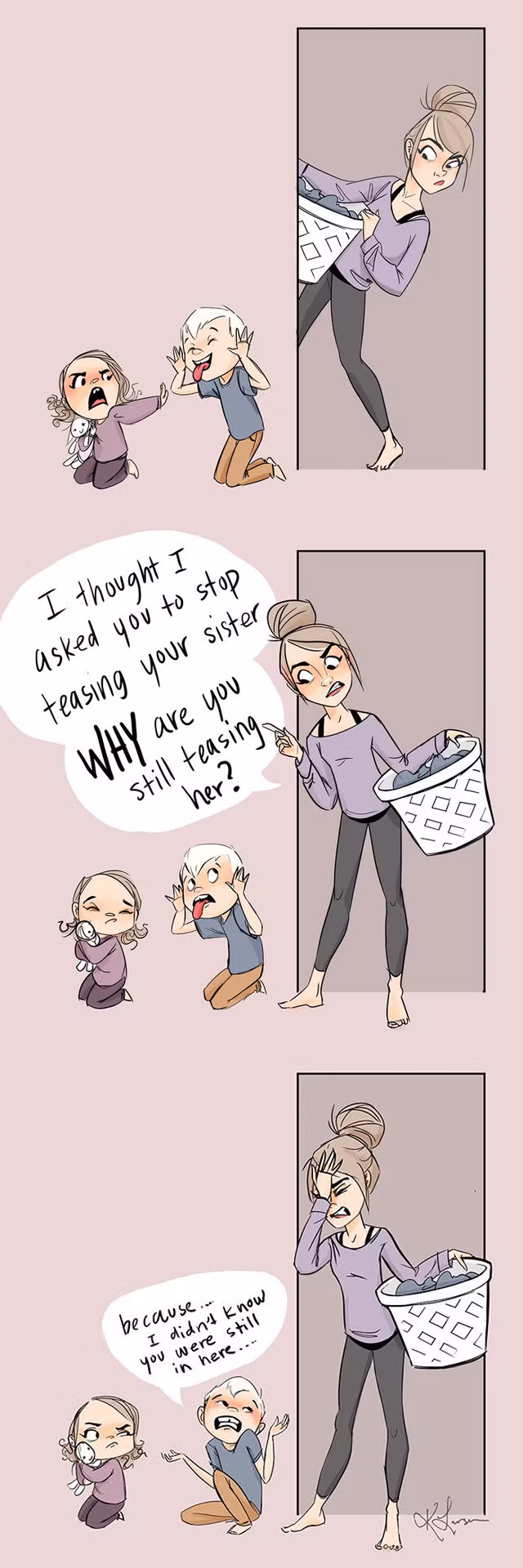 "Mẹ tưởng mẹ nói con không được trêu em rồi, tại sao con vẫn trêu em?"/ "Bởi vì... con không biết mẹ vẫn ở đây".