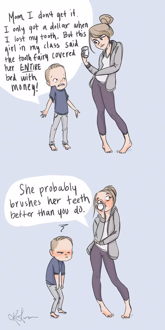 "Mẹ, con không hiểu tại sao, con chỉ được có 1 đô la khi rụng răng. Nhưng bạn ở lớp con nói bà tiên răng đã phủ tiền đầy giường bạn ấy"/ "Hẳn là bạn ấy đánh răng thường xuyên hơn con rồi".