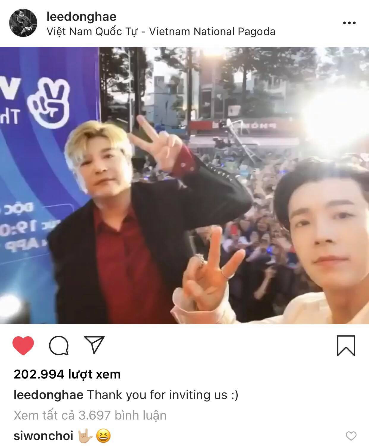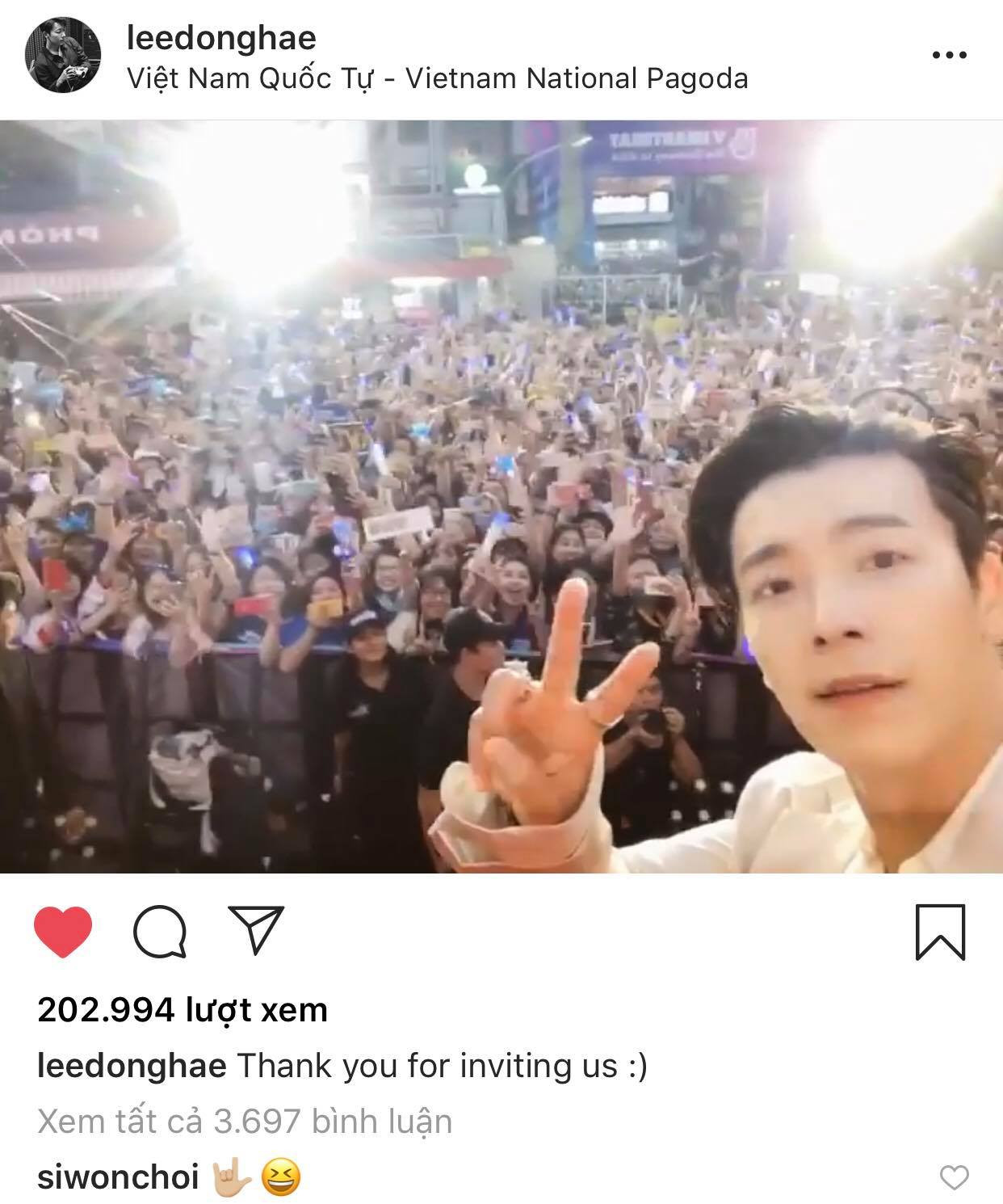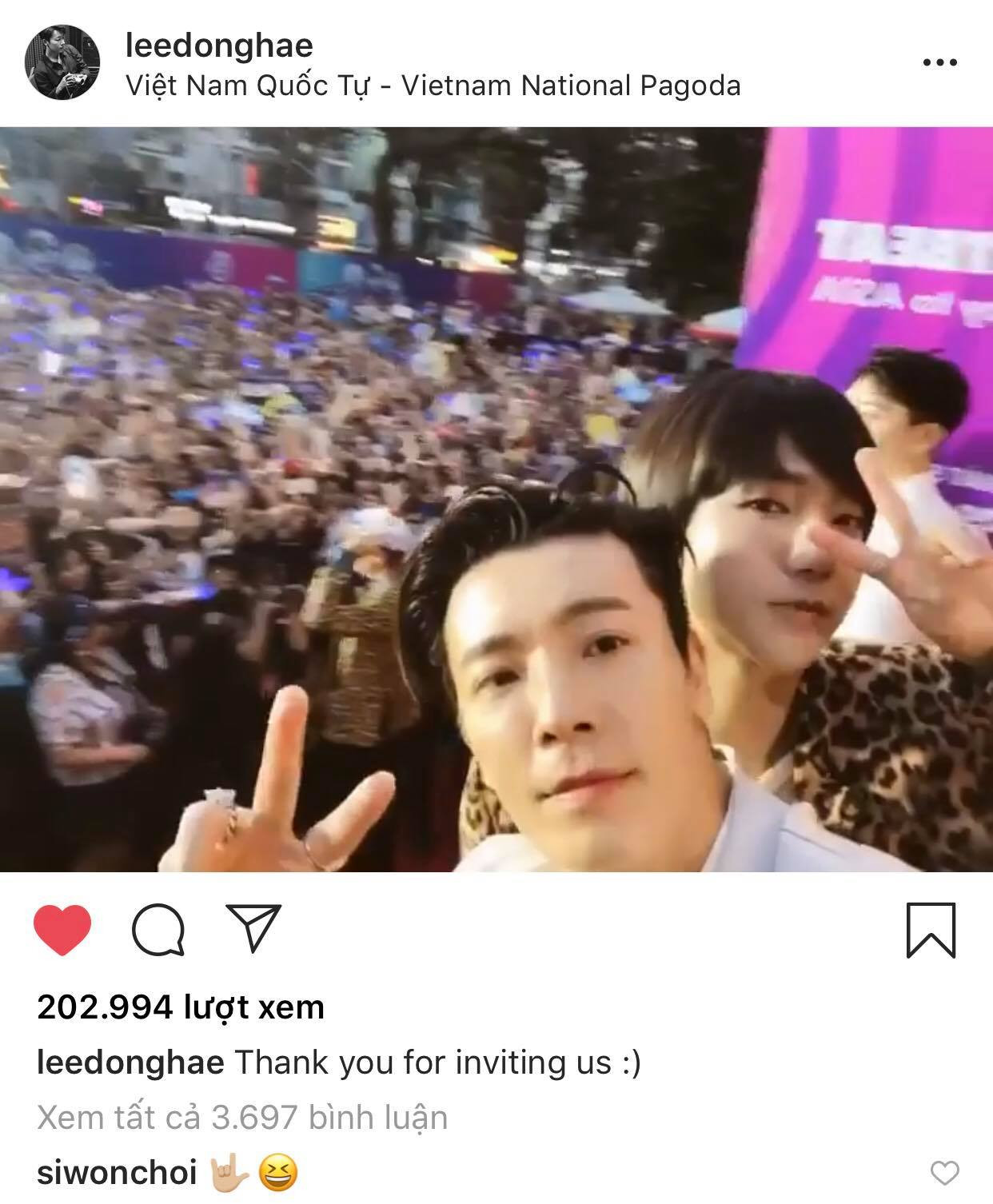 Còn rất nhiều khoảnh khắc đáng nhớ nữa của V-E.L.F và SuJu trong ngày 29/3 và một trong số đó liên quan đến Donghae, vụ anh chàng quay phim các thành viên và fan. Donghae đã đăng video đó lên Instagram cá nhân của anh để cám ơn V-E.L.F. Tuy nhiên, thay vì chọn địa điểm check-in là Nhà hát Hòa Bình thì Donghae đã "bé cái nhầm" sang... Việt Nam Quốc Tự, khiến E.L.F buồn cười quá chừng.