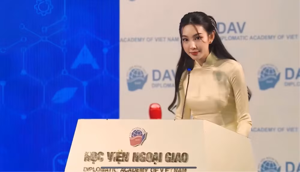 HHTO - Ngày 22/4, Hoa hậu Nguyễn Thúc Thùy Tiên có mặt tại Học viện Ngoại giao để tham dự chương trình đối thoại giữa Tổng Thư ký ASEAN với thanh niên ASEAN.