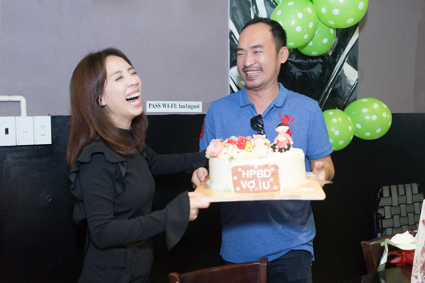 Riêng ông xã Tiến Luật đã chuẩn bị chiếc bánh kem có hình hai vợ chồng và bé Andy kèm theo dòng chữ “Chúc mừng sinh nhật vợ yêu” đầy ngọt ngào. Hành động lãng mạn của ông xã đã khiến nữ nghệ sĩ vô cùng cảm động.