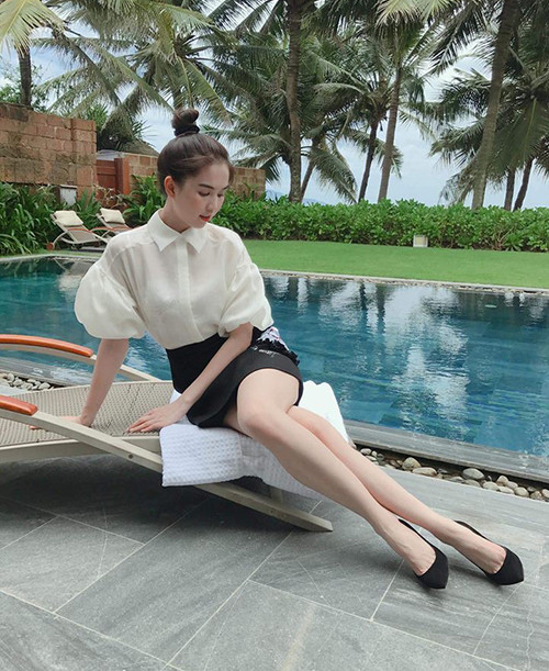 Bộ cánh này cũng từng được đàn chị Ngọc Trinh diện trước đó. Dù hơn Tiểu Vy đến 10 tuổi nhưng Ngọc Trinh trông trẻ trung không kém nhờ kiểu tóc búi củ tỏi.