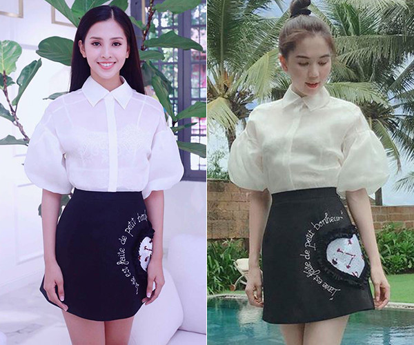 Đây là màn đụng độ trang phục đầu tiên của Tiểu Vy sau khi đăng quang. Tân Hoa hậu và Ngọc Trinh, mỗi người một vẻ "bất phân thắng bại" khi cùng diện set váy này.