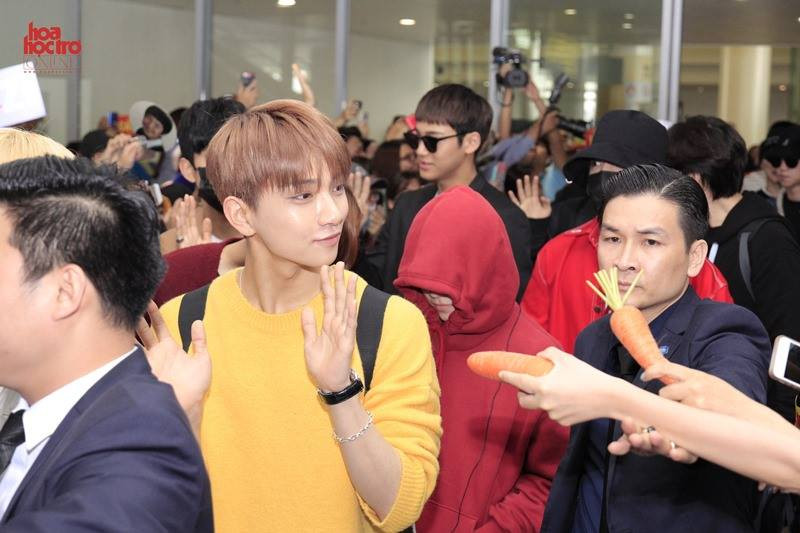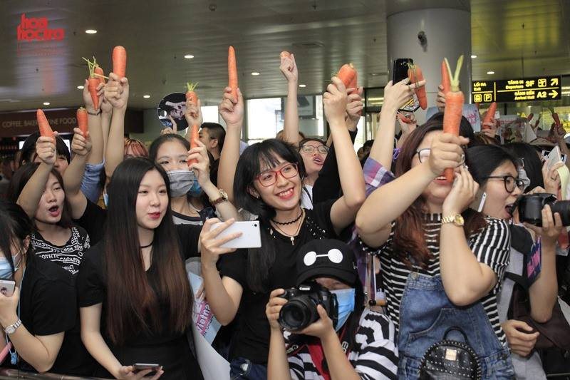 Nổi bật nhất sân bay hẳn là các bạn Carat (fandom Seventeen). Mang cả... cà rốt đi đón thần tượng cơ mà. "Bật mí" nha, vì Carat trong tiếng Hàn phát âm nghe rất giống với cà rốt nên đó là lý do vì sao Carat và cà rốt thường song hành với Seventeen đó. Và hôm nay, theo lời của fan tường thuật lại thì Seungkwan đã nhìn "ruộng cà rốt" của các Carat đấy. Jun đi cuối cùng, tuy bị đau mắt nhưng vẫn cố gắng mở to mắt để ngắm các fan. Anh chàng còn giơ tay định lấy cà rốt nữa cơ.