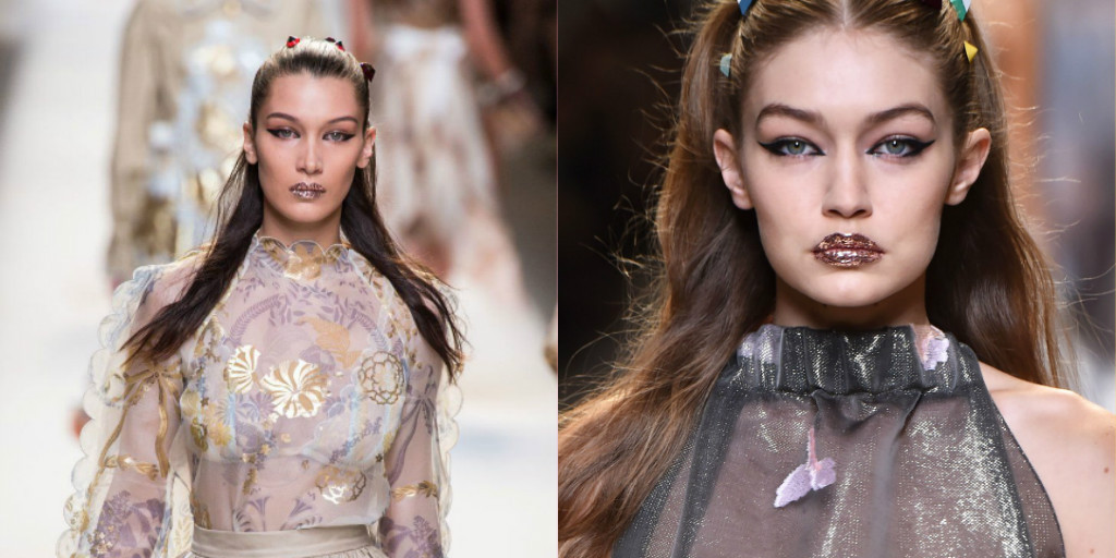 Hai chị em Gigi và Bella Hadid trong tạo hình của makeup artist Peter Philips cùng với đôi môi đính kim tuyến lấp lánh trên sàn diễn Fendi 2017.
