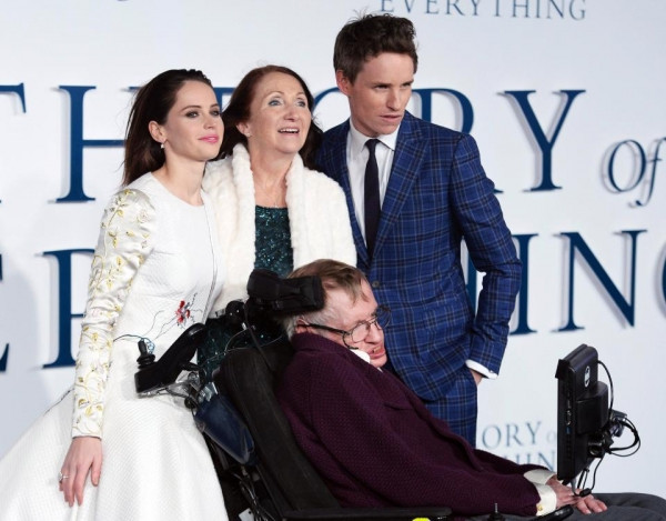 Hawking và Jane chụp ảnh cùng hai diễn viên chính trong bộ phim Thuyết yêu thương.