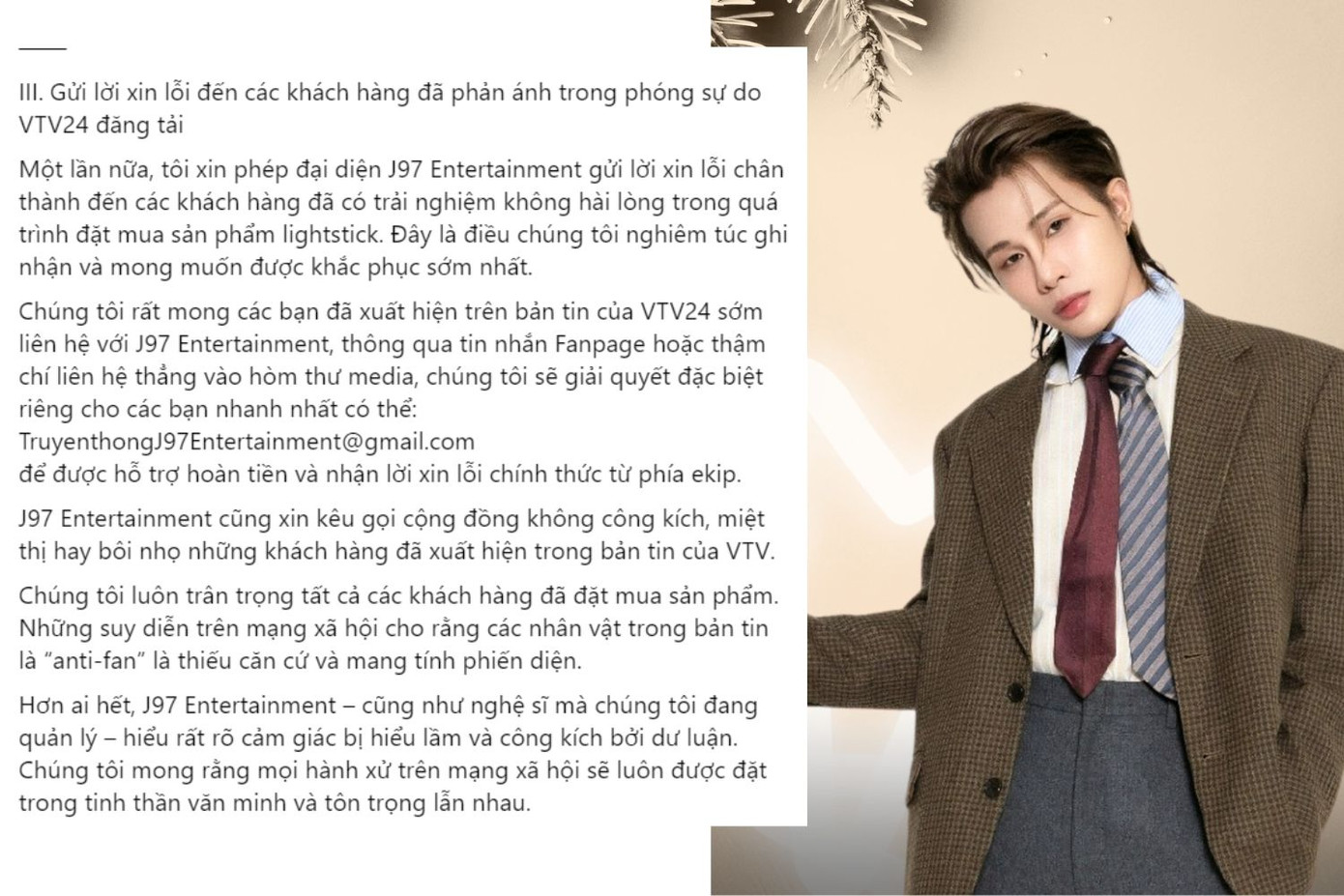Phía công ty cho rằng cách thực hiện phỏng vấn của phóng viên là thiếu chuyên nghiệp vì không xác minh tư cách người nhận cuộc gọi, không liên hệ bộ phận truyền thông chính thức của J97. Cuối cùng, J97 Entertainmen gửi lời xin lỗi các khách hàng đã phản ánh về trải nghiệm không tốt khi đặt mua lightstick.