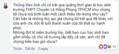 Không chỉ có các cư dân mạng, các cựu học sinh của trường cũng bày tỏ quan điểm của mình trong sự việc này. Bạn Khánh An - Sinh viên ĐH Luật TP.HCM, cựu học sinh Lê Hồng Phong khóa 2014 - 2017 cho biết: “Theo mình thì việc các em bày tỏ cảm xúc của mình, sống với những kỉ niệm tuổi học trò rất đáng quý. Không nên bình luận theo hướng tiêu cực như thế!”