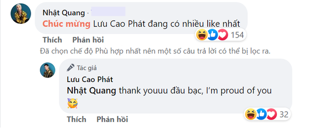 Không chỉ người hâm mộ mà các đồng đội cũng rất vui mừng khi Lưu Cao Phát hiện đang giữ số lượng bình chọn cao nhất, bình luận dưới bài viết của bạn mình, Nhật Quang viết: "Chúc mừng Lưu Cao Phát đang có nhiều like nhất". Đáp lại tình cảm của người anh em, Lưu Cao Phát cũng gửi lời cảm ơn và cho biết anh rất tự hào về đồng đội của mình.