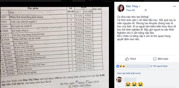 Chỉ sau vài giờ đăng tải, bài viết của cô nàng nhanh chóng thu hút hơn 12.000 lượt thích và hàng nghìn bình luận. Mặc dù đạt kết quả học tập tốt và cầm tấm bằng loại xuất sắc trên tay nhưng cô bạn lại tiếc nuối vì 4 năm học Đại học không chú ý tích lũy thật nhiều kinh nghiệm thực hành từ thực tế cho bản thân. "Đúng là bằng cấp không phải thứ quan trọng quyết định mọi việc. Bản thân mình đã từng rơi vào trường hợp như thế khi đi tìm việc làm thêm. Hầu hết các tin tuyển dụng đều yêu cầu kinh nghiệm làm việc và bằng cấp chỉ cần từ trung cấp hoặc cao đẳng trở lên đối với một số công ty. Vì ít kinh nghiệm nên có lần mình đi xin việc mà không được".