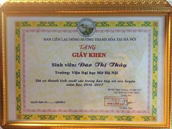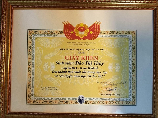 Không uổng phí công sức ngày đêm chăm chỉ học tập, cô bạn Đào Thị Thủy (SN 1996), sinh viên ngành Kế Toán, Viện Đại học mở Hà Nội đã đạt được kết quả như mong đợi khi điểm tổng kết các kì đều đạt loại giỏi, xuất sắc.