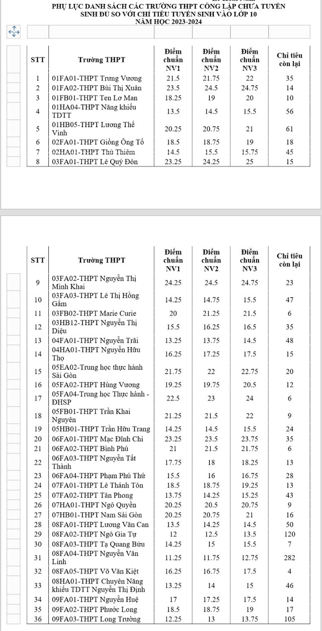 Trước đó, chiều 2/8, UBND TP.HCM đã có văn bản thông báo cho phép tuyển sinh bổ sung vào lớp 10 năm học 2023 - 2024. Đồng thời, giao Sở GD&ĐT rà soát lại tình hình tuyển sinh thực tế ở các cơ sở giáo dục vẫn còn thiếu chỉ tiêu và quyết định việc tuyển sinh bổ sung vào lớp 10 năm học 2023-2024.