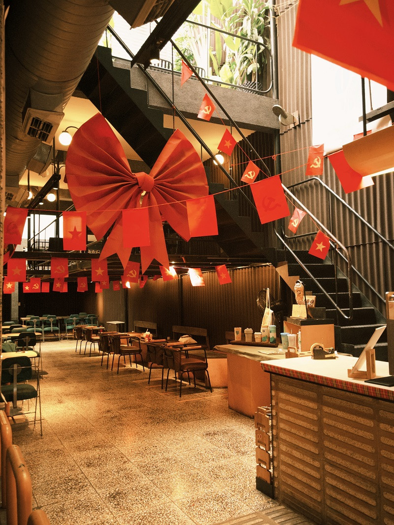 Thưởng thức nước uống tại quán, bạn sẽ thích thú với những ly nước được trang trí rất sáng tạo: Lớp kem trắng mịn trên cùng được “vẽ” hình lá cờ đỏ sao vàng một cách tỉ mỉ và đẹp mắt. Lên đến tầng 2, một khu vườn xanh mát hiện ra và điểm nhấn không thể bỏ qua chính là lá cờ Tổ quốc cỡ lớn được trang trọng đặt ở vị trí trung tâm, sẵn sàng cho những bức ảnh “nghìn like” của bạn.