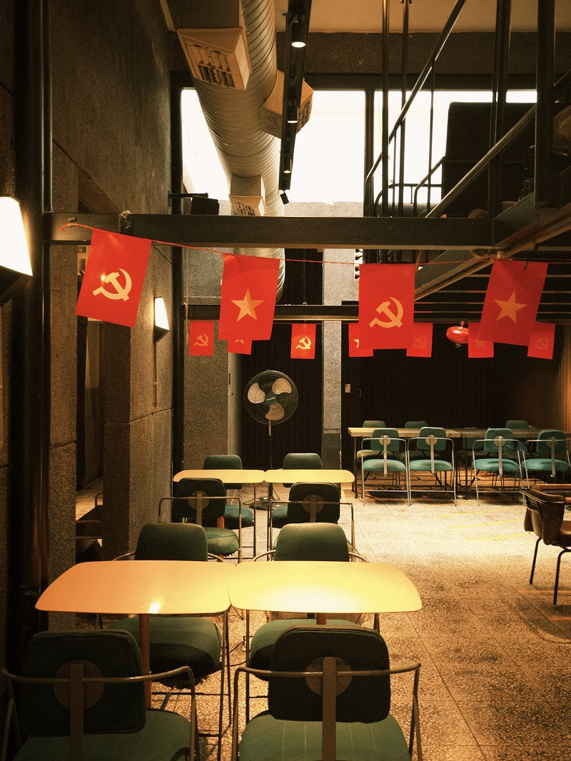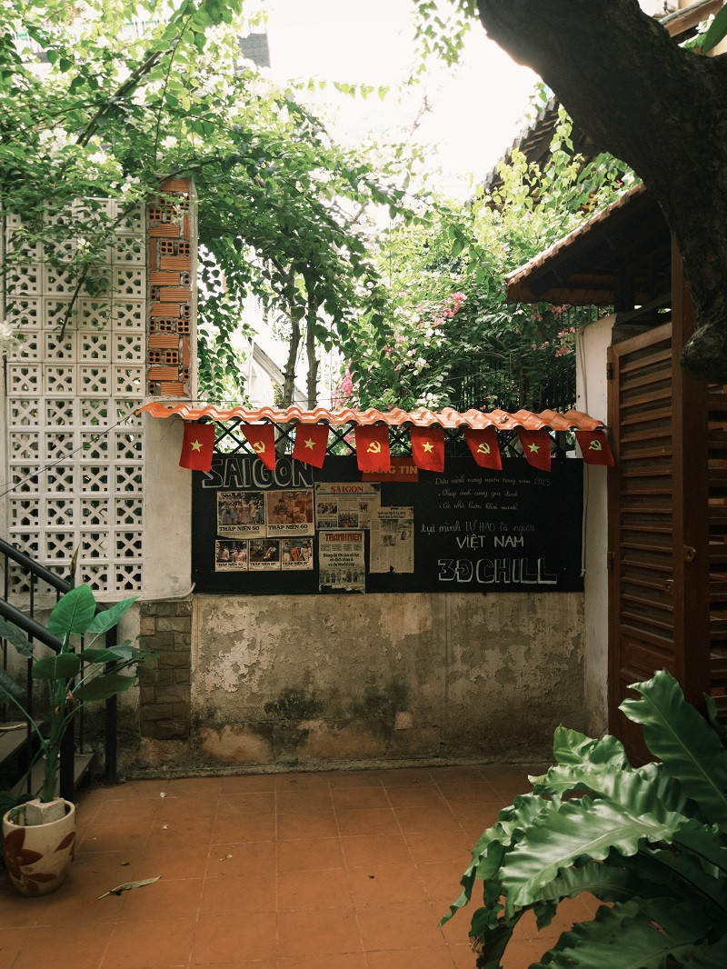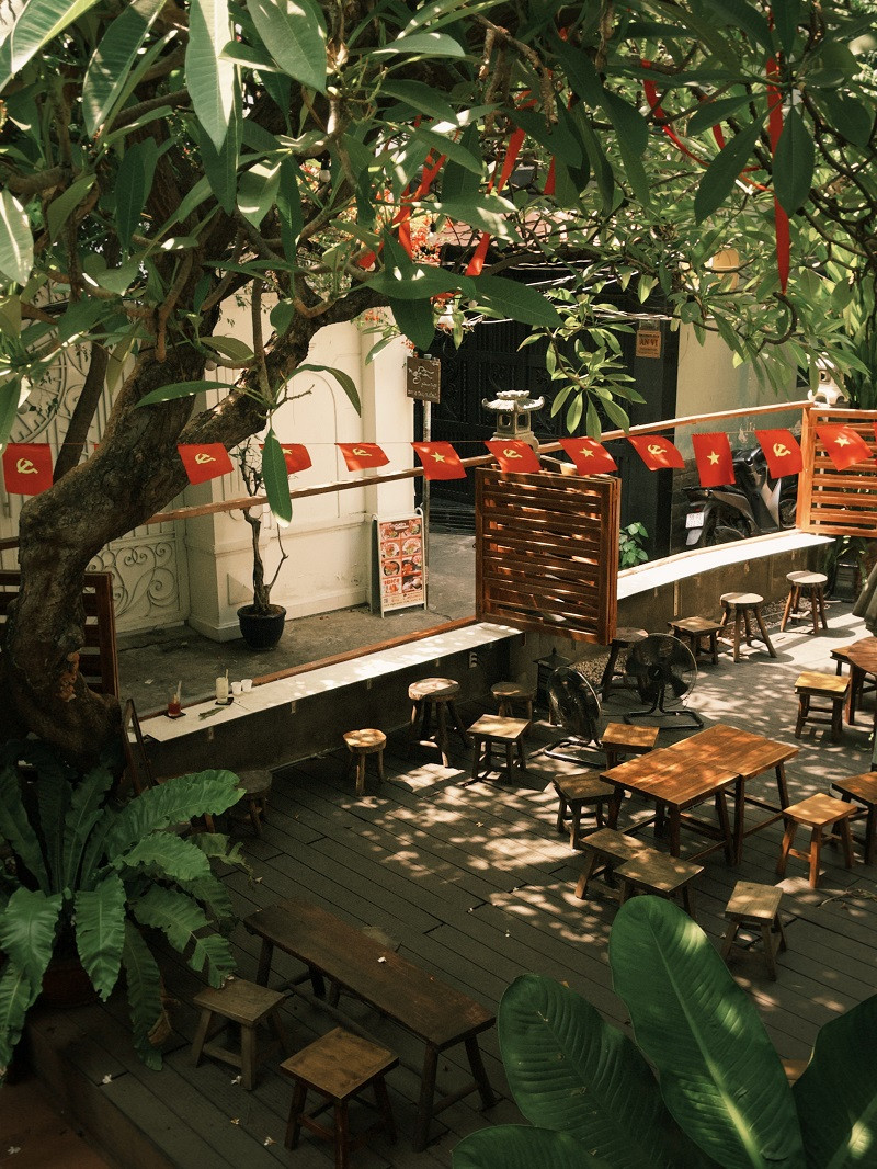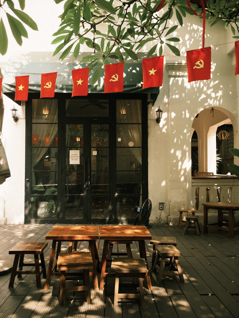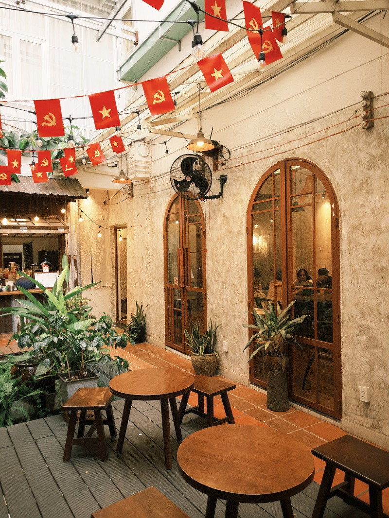 Đặc biệt, những khung cửa sổ lớn nhìn ra đường phố không chỉ mang đến ánh sáng tự nhiên mà còn tạo nên những góc ngồi chill cực kỳ lãng mạn, với lá cờ Tổ quốc thấp thoáng trong tầm mắt. Khoảng sân ngập nắng của quán chắc chắn sẽ là bối cảnh tuyệt vời cho những bức ảnh vintage chan chứa tinh thần yêu nước nồng nàn của mỗi người dân.