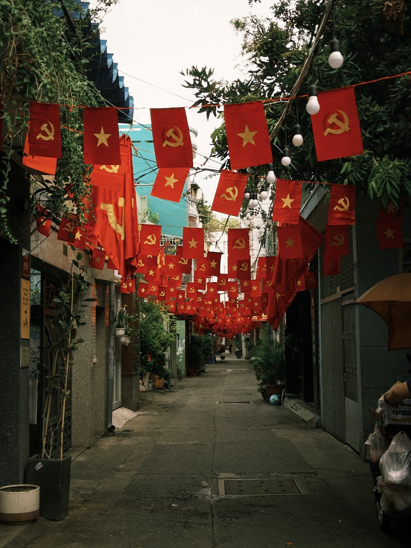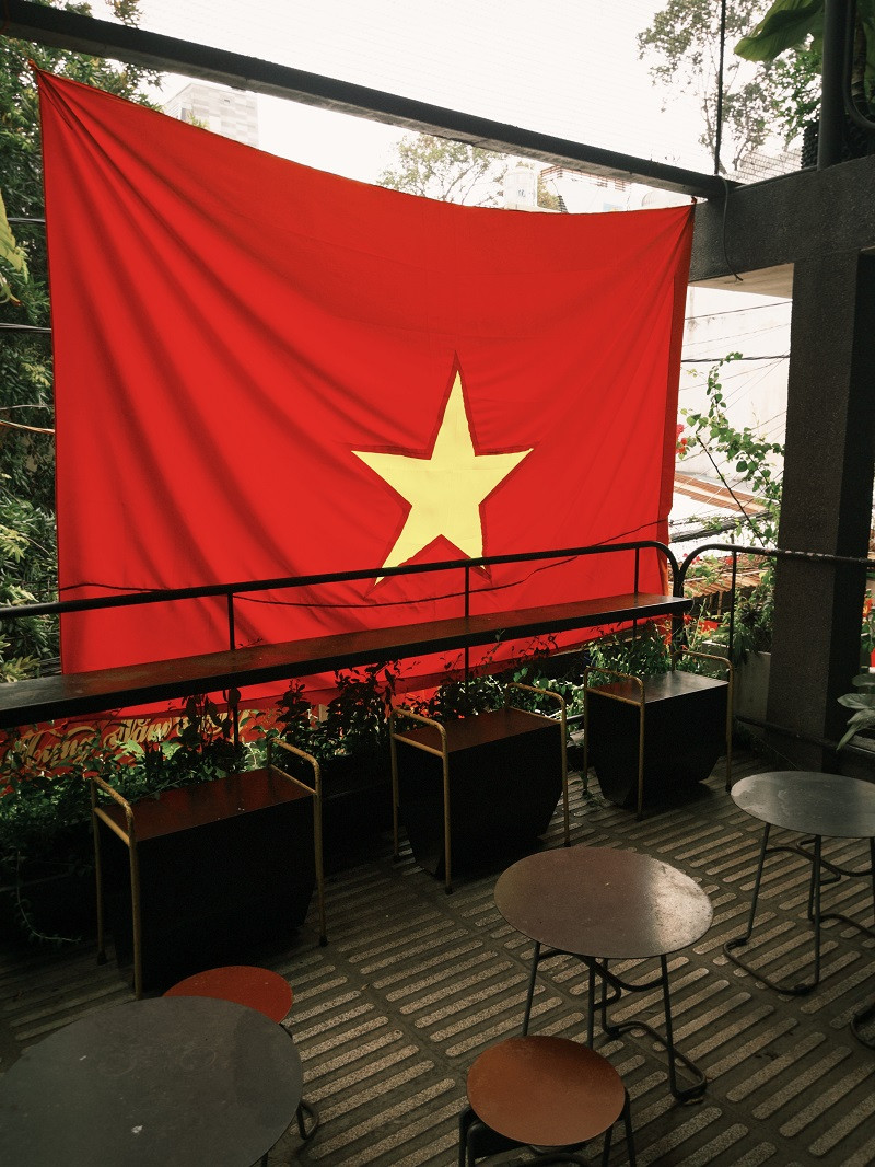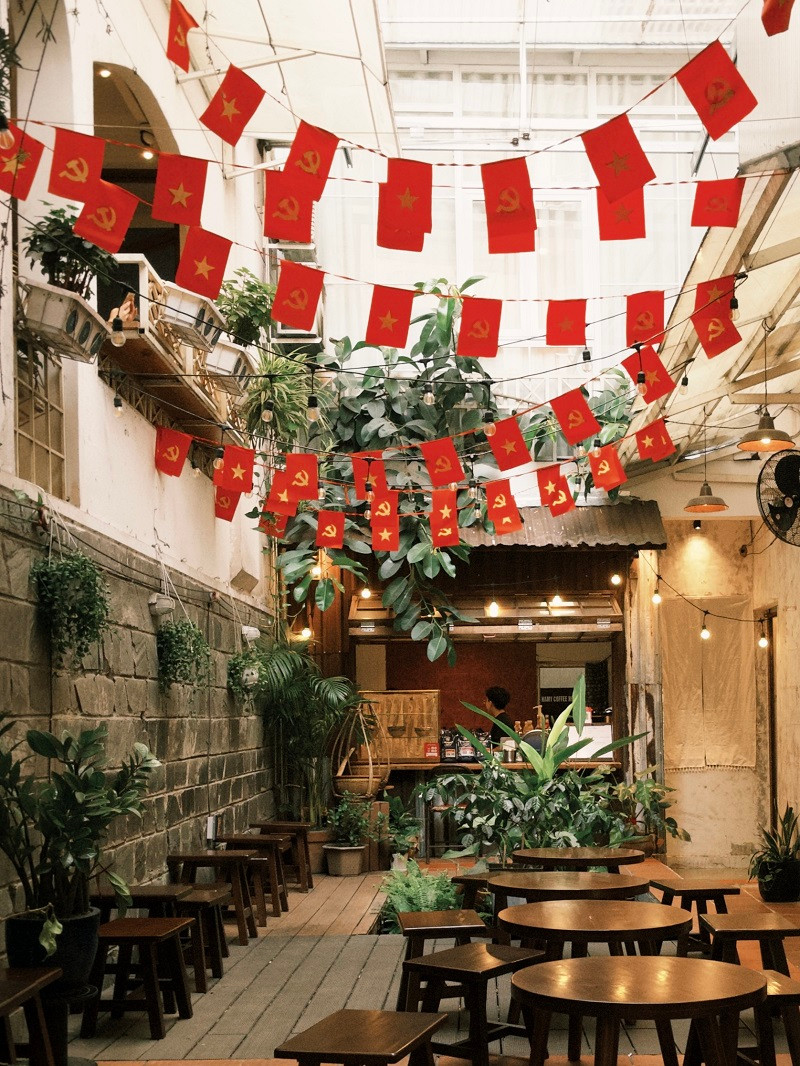 Nằm sâu trong một con hẻm nhỏ trên đường Nguyễn Thị Minh Khai (Quận 1), điều khiến Hamy trở nên thu hút trong những ngày này chính là không gian ngoài trời được trang trí rợp bóng cờ đỏ sao vàng. Những lá cờ bay phấp phới trong gió, tạo nên một khung cảnh vừa lãng mạn vừa trang trọng.