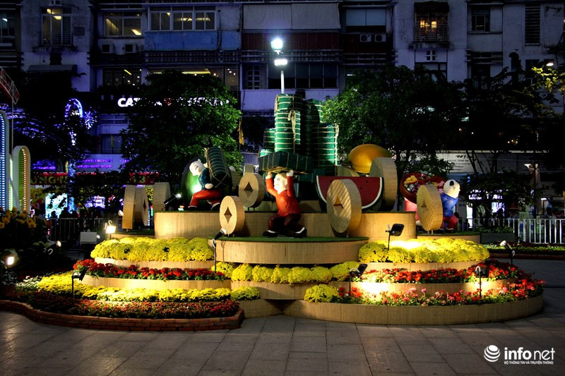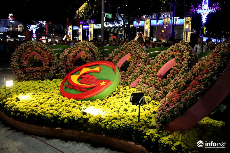 Đường hoa năm nay được tạo hình với các tiểu cảnh mới lạ, nhiều loại hoa quý cũng được bổ sung. Trong ảnh là biểu tượng của TP.HCM nổi bật giữa thảm hoa.