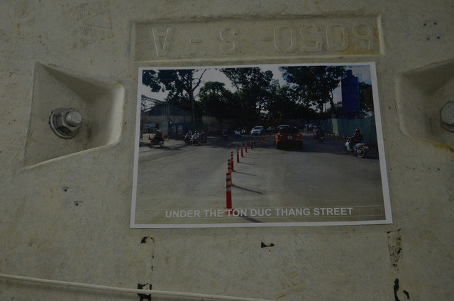 Tại vị trí bên dưới hầm, đơn vị thi công đánh dấu tấm hình (đồng nghĩa với trên nóc hầm là đường Tôn Đức Thắng).