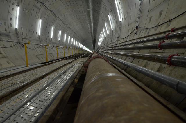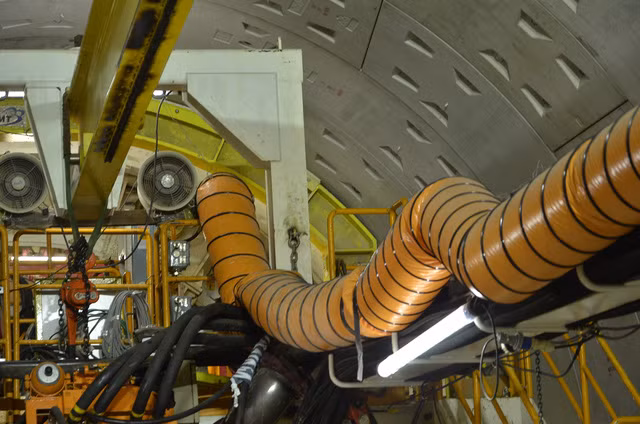Đường ống màu vàng đưa không khí sạch vào hầm, đảm bảo không gian thi công trong hầm sâu luôn thông thoáng.