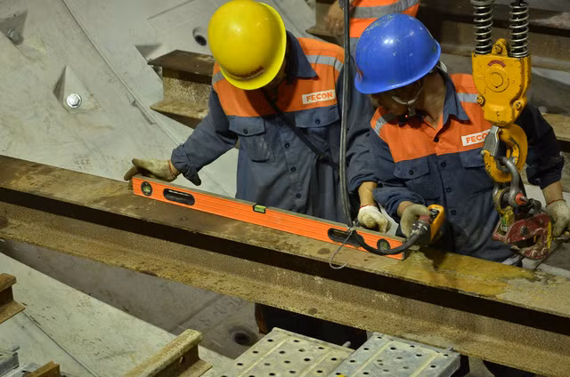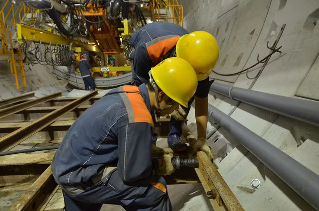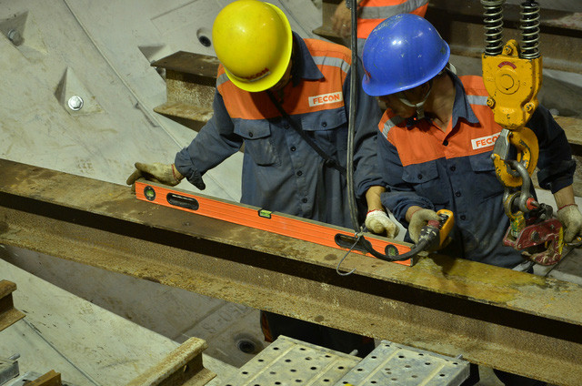 Cứ sau mỗi đoạn hầm được lắp ráp, các công nhân sẽ tiến hành lắp đặt khung sắt đến gần với robot để vận chuyển thiết bị phục vụ thi công.