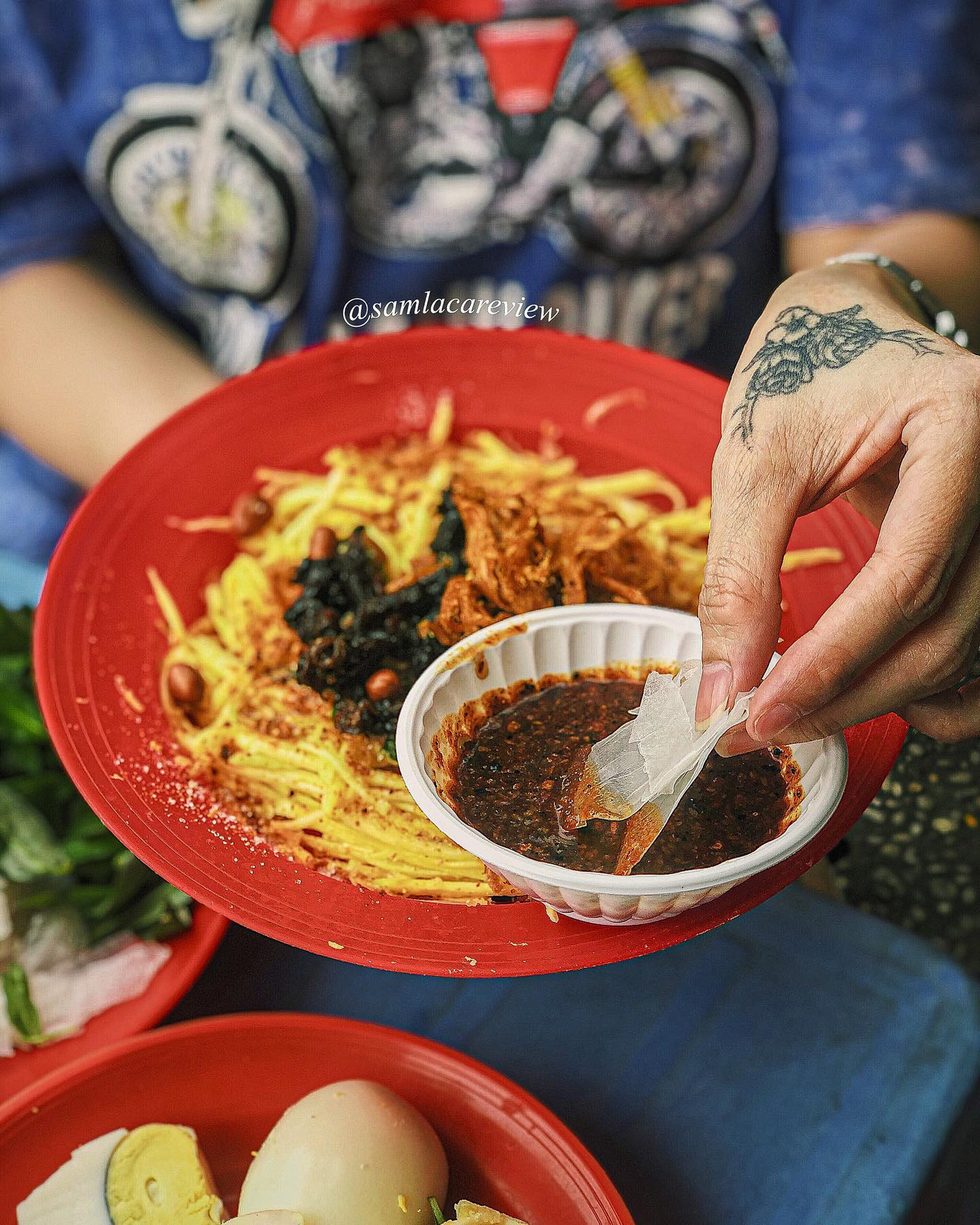 Ảnh: Sam NguyễnGoogle map: Bánh tráng trộn dì Hai - Số 209/94/1 Tôn Thất Thuyết, Quận 4 (đối diện trường tiểu học Lê Thánh Tôn), TP.HCM. Dì Hai mở bán từ 6 giờ sáng đến 6 giờ chiều. Giá 10K/ bịch bánh tráng chấm sốt, 10K/ 3 trứng gà, 15K gỏi xoài.