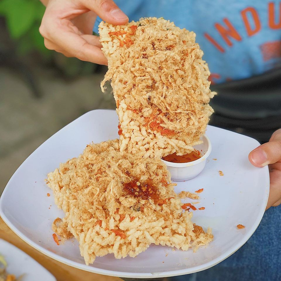 Bánh tráng được cuốn chắc tay và cực nhiều nhân, chấm với sốt chua ngọt bao ghiền. Không thể không nhắc tới “người bạn láng giềng” cơm cháy chà bông khá giản dị với hai miếng cơm cháy giòn rụn phối chung với chà bông và ruốc, ăn kèm sốt mắm rất phê.