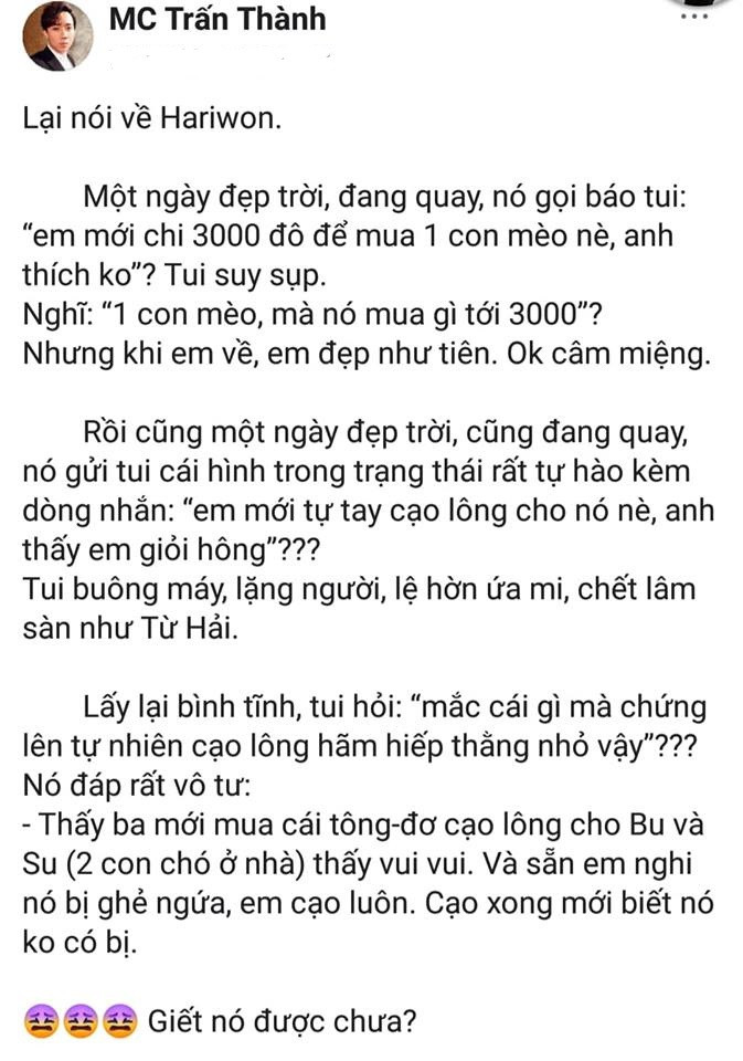 "Lại nói về Hariwon. Một ngày đẹp trời, đang quay, nó gọi báo tui: “Em mới chi 3000 đô để mua 1 con mèo nè, anh thích ko”? Tui suy sụp.