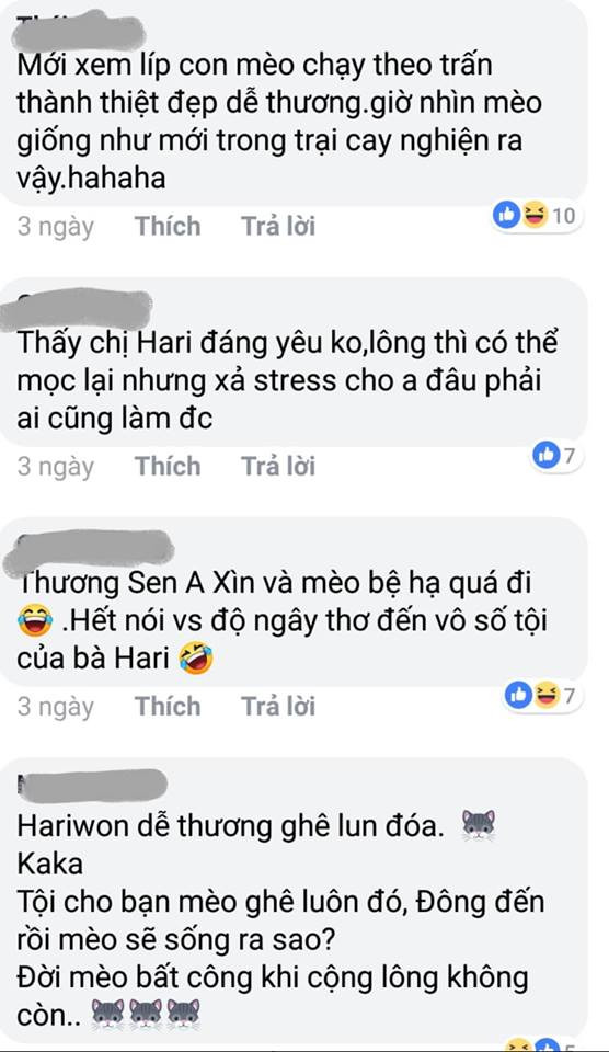 Dòng trạng thái này ngay lập tức trở thành đề tài chú ý của đông đảo khán giả, người hâm mộ. Ai ai cũng không khỏi ôm bụng cười về độ "lầy lội" của bà xã Hari Won cũng như bày tỏ lòng cảm thương sâu sắc đến Trấn Thành cũng như chú mèo tội nghiệp kia.