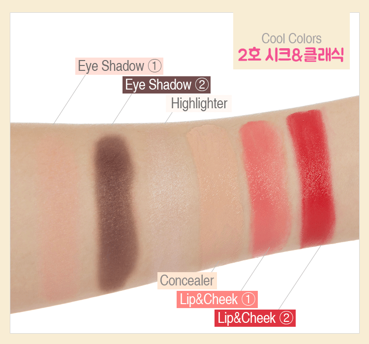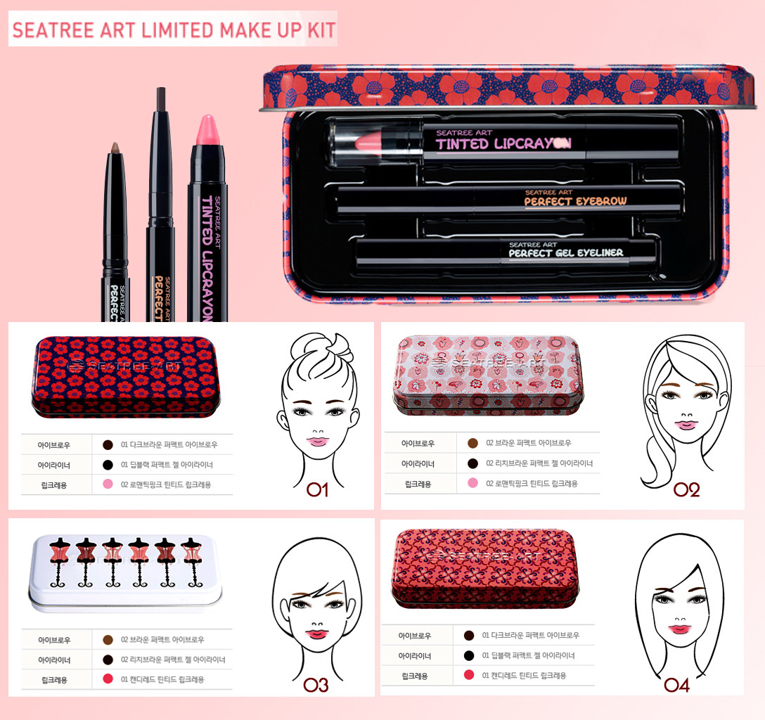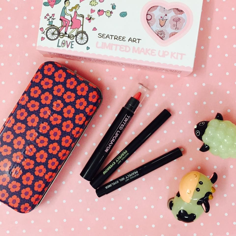 Bộ trang điểm này bao gồm tất cả những thứ mà con gái cần để có diện mạo cơ bản nhưng vẫn lung linh. Trong hộp kim loại nhỏ gọn trông như hộp bút có 1 chì kẻ mày, 1 chì kẻ eyeliner và 1 son môi. Với mỗi phiên bản có các màu son, chì kẻ, kẻ mắt khác nhau.