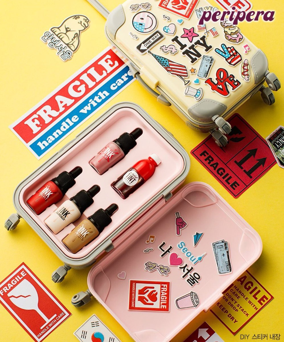 Hè năm nay, Peripera cho ra mắt bộ trang điểm có thiết kế "xịn" như một chiếc vali được các teen girl đua nhau săn đón. Bên trong chiếc vali này bao gồm 2 son kem, 1 son tint, 1 kem che khuyết điểm và một kem tạo khối đa chức năng. Đặc biệt là có tận 2 màu vali cho bạn lựa chọn, đi kèm là bộ sticker để bạn thỏa thích trang trí.