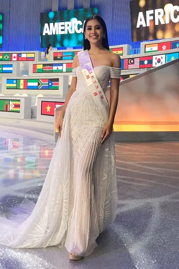 Hoa hậu Tiểu Vy khi đi thi Miss World 2018 đã mặc váy trắng trong đêm Chung kết. Bộ váy có kiểu dáng trễ vai để nhấn mạnh vào vóc dáng thanh thoát của nàng hậu, thân váy đính những dải đá lấp lánh tạo thành hình tia nắng tượng trưng cho ngày mới tràn đầy năng lượng.