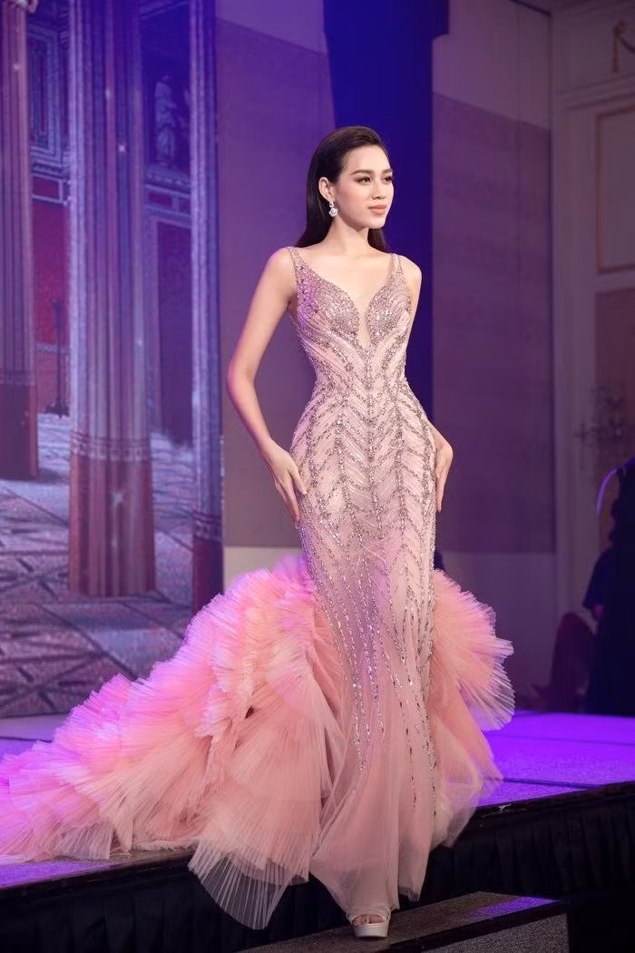 Chẳng hạn Đỗ Thị Hà khi đến với Miss World 2021 đã khoe hai thiết kế để cô lựa chọn cho đêm thi quan trọng nhất. Bộ thứ nhất có kiểu dáng đơn giản, có chất liệu xuyên thấu đính kết những bông hoa pha lê màu xanh với phần áo choàng thướt tha phía sau.