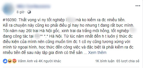 “Kể ra chuyện này cũng không phải điều gì hay ho nhưng tôi đang rất bực mình. Tôi năm nay 26 tuổi trai Hà Nội gốc, xinh trai, da trắng môi hồng... Từ lúc năm nhất đến giờ tôi luôn ý thức được điều kiện của mình nên cũng muốn tìm được một cô người yêu cũng tương xứng với mình từ ngoại hình, học thức đến công việc và đặc biệt là phải kiếm ra được nhiều tiền để sau này lập gia đình có thể san sẻ tài chính cho tôi để tôi không phải lam lũ kiếm tiền, mà với điều kiện của mình tôi nghĩ mình xứng đáng được hưởng điều đấy.
