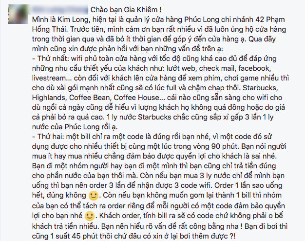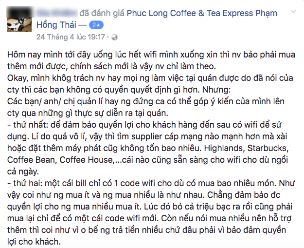 Theo như anh C.K.Long, quản lý cửa hàng café và trà Phúc Long chi nhánh Phạm Hồng Thái (Q.1, TP.HCM), chia sẻ thì nhóm khách hàng trong đó có người sử dụng Facebook với tên G.K đến uống nước tại cửa hàng và ngồi suốt... 11 tiếng nhưng không gọi thêm món gì mà vẫn muốn được cấp thêm mã sử dụng wifi. Anh Long trả lời rằng nhân viên phục vụ đã thực hiện đúng quy định của công ty, từ chối yêu cầu thêm thời gian sử dụng wifi của nhóm khách này vì không muốn tạo tiền lệ xấu. Sau đó, khách hàng G.K đã có phản hồi trên trang Facebook của cửa hàng: