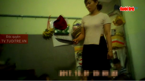 Bảo mẫu đưa dao lên hăm dọa các cháu nhỏ. (Ảnh: Cắt từ clip báo Tuổi trẻ)