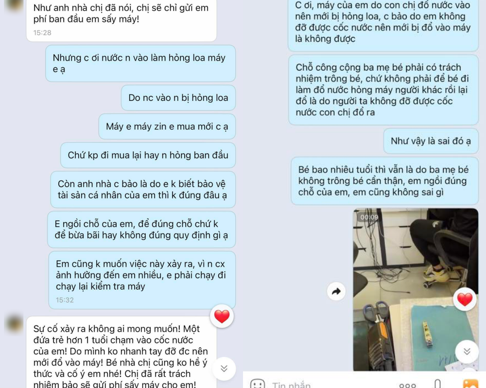 Khi Lê Hậu khẳng định máy mua mới và chưa từng qua sửa chữa thì bố của cháu bé lại từ chối trách nhiệm để khắc phục sự cố do con mình gây ra: "Anh không biết máy em mua lại hay mua bóc seal nhưng anh sẽ không chịu trách nhiệm thêm gì ngoài trả 150K tiền sấy máy. Em mang máy ra ngoài thì em phải tự bảo quản, còn trẻ con nó không biết gì, nó làm đổ vào là không may, việc của em là bảo quản máy, không bảo quản được là lỗi do em. Còn em có thích tác động thế nào thì tác động, anh chị sẽ không đền máy cho em đâu, anh nói thế cho em hiểu, còn chị đang cho cháu ngủ rồi, thế nhé".