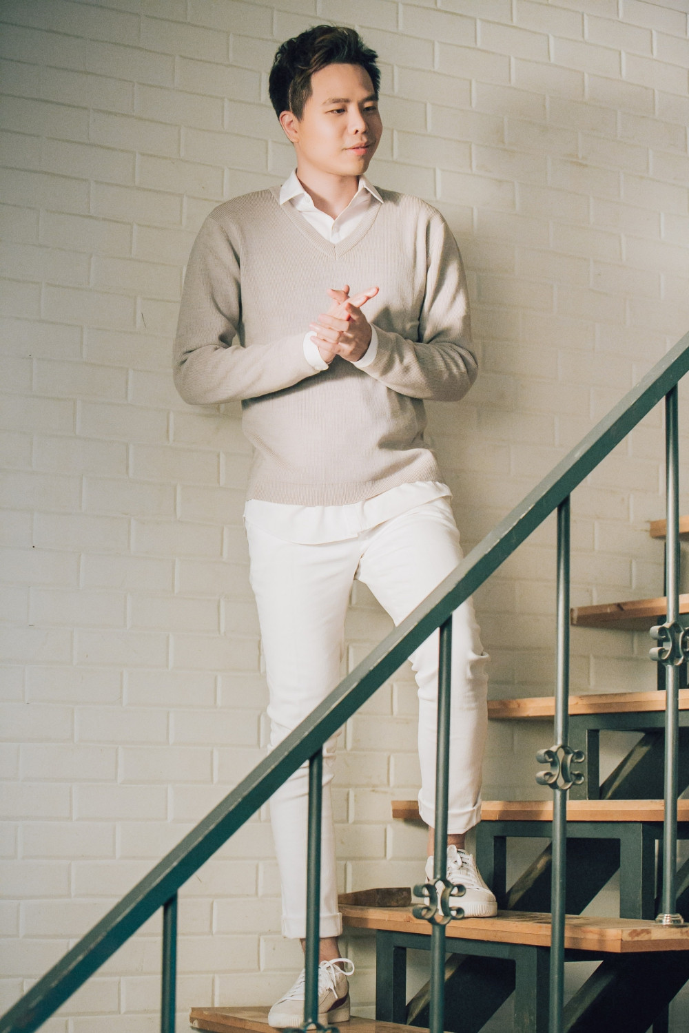 Kết hợp quần áo theo phong cách white on white truyền thống, Trịnh Thăng Bình khéo léo dùng thêm một chiếc áo len màu be để set đồ không bị nhàm chán mà vẫn giữ được sự tinh tế, thanh lịch.