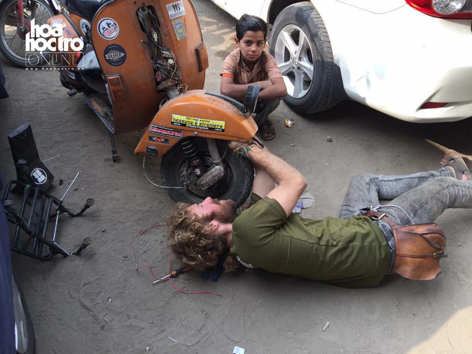 Pietro đã phải tự tay sửa chiếc vespa của mình khi hỏng hóc. (Ảnh: NVCC)