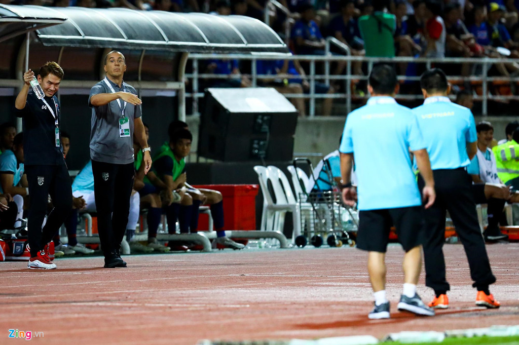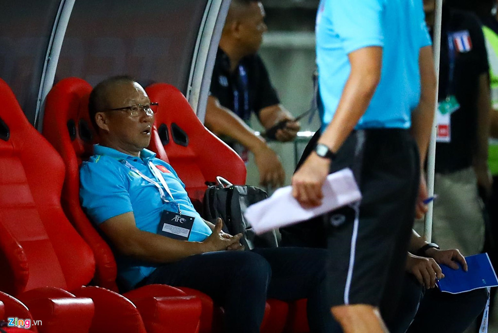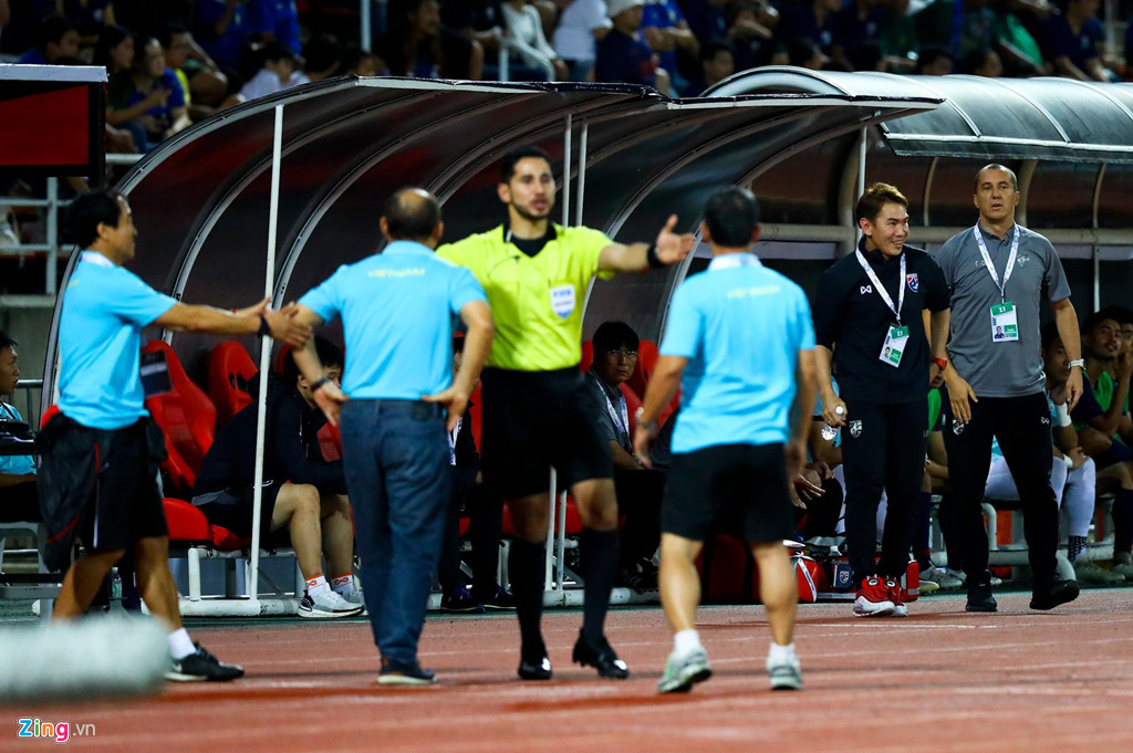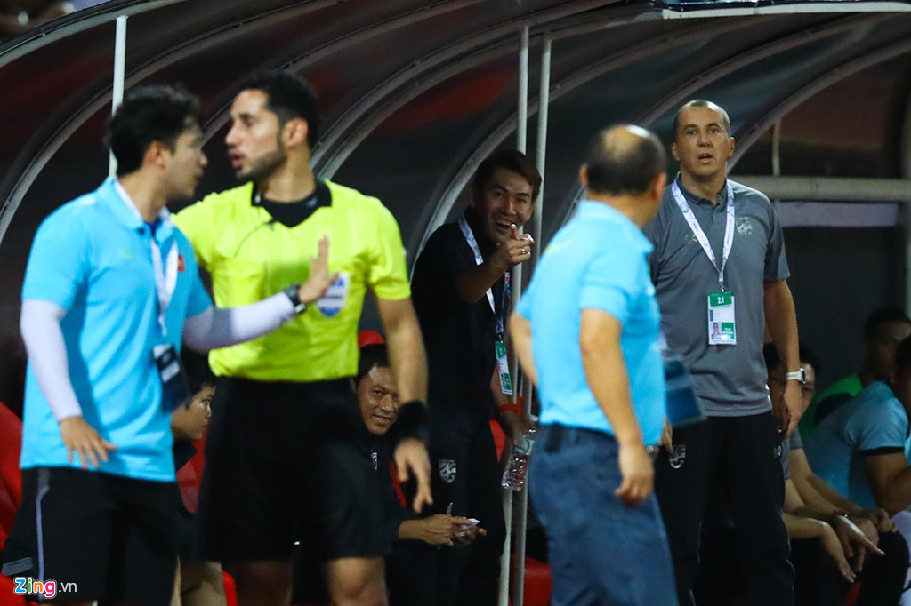 Một trong những tình huống đáng chú ý nhất của ông Park xảy ra ở hiệp 2 khi ban huấn luyện tuyển Việt Nam phản ứng với một pha bóng và có lẽ đã di chuyển lấn vào khu vực ban huấn luyện Thái Lan. Lập tức, HLV thủ môn Sasa Todic (áo xám) và trợ lý Anurak Srikerd (áo đen) chạy ra yêu cầu ông Park về chỗ theo cách phản cảm.